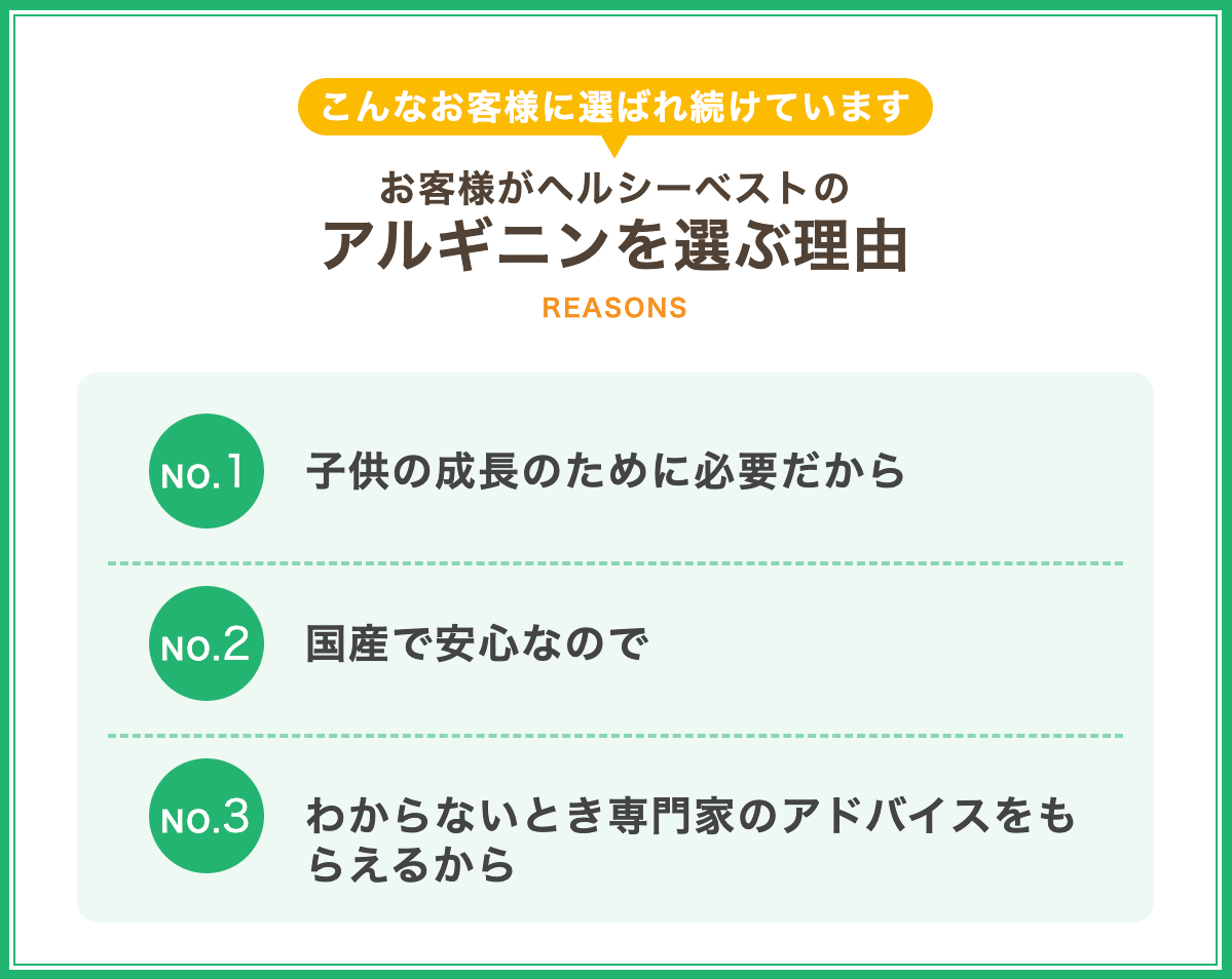 アルギニンは聞きなれない栄養素かもしれませんが、 成長期に欠かせない、成長成分です。 アルギニンが不足すると、成長に悪影響が出てしまいます。 そのため、成長期はアルギニンがより多く必要とされているため、成長期には必ず補給しなければいけない栄養素である「必須アミノ酸」と定められています。