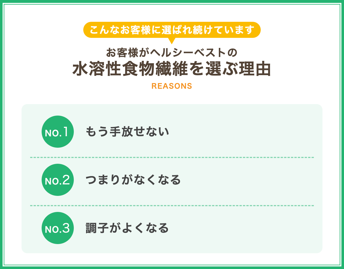 ヘルシーベストの「水溶性食物繊維」は、食物繊維の含有率が85%以上と高く、トップのリピート率を誇っています。