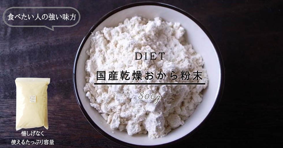 おから粉末の原料は国産の遺伝子組み換えしていない大豆を使用しています。 食物繊維も豊富に含まれていますので、ダイエット時に食欲が抑えられないときは、おから粉末を使ったお料理にもご利用ください。