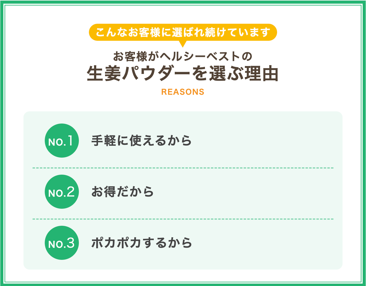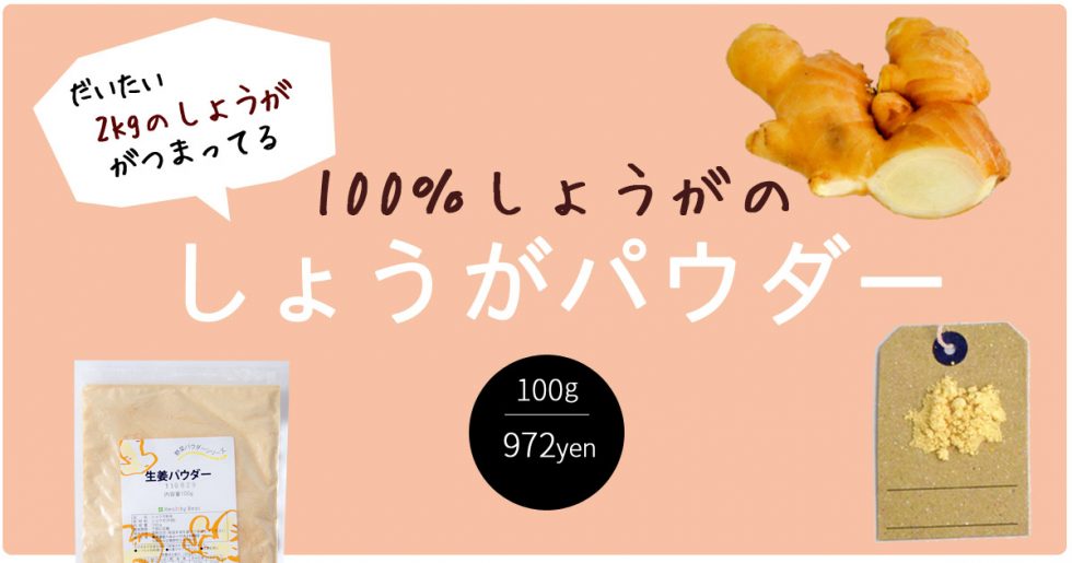 生姜は、400種以上もの栄養成分を含んでいますが、中でも、辛み成分のジンゲロールとショウガオールが生姜パワーの源です。辛味成分をもつ唐辛子やこしょうと違って じっくりと優しく働いてくれるのが特徴です。生姜パウダーには、「ショウガオール」が豊富に含まれていて、皮をつけたまま乾燥させて粉末にするので、精油の成分も含まれています。