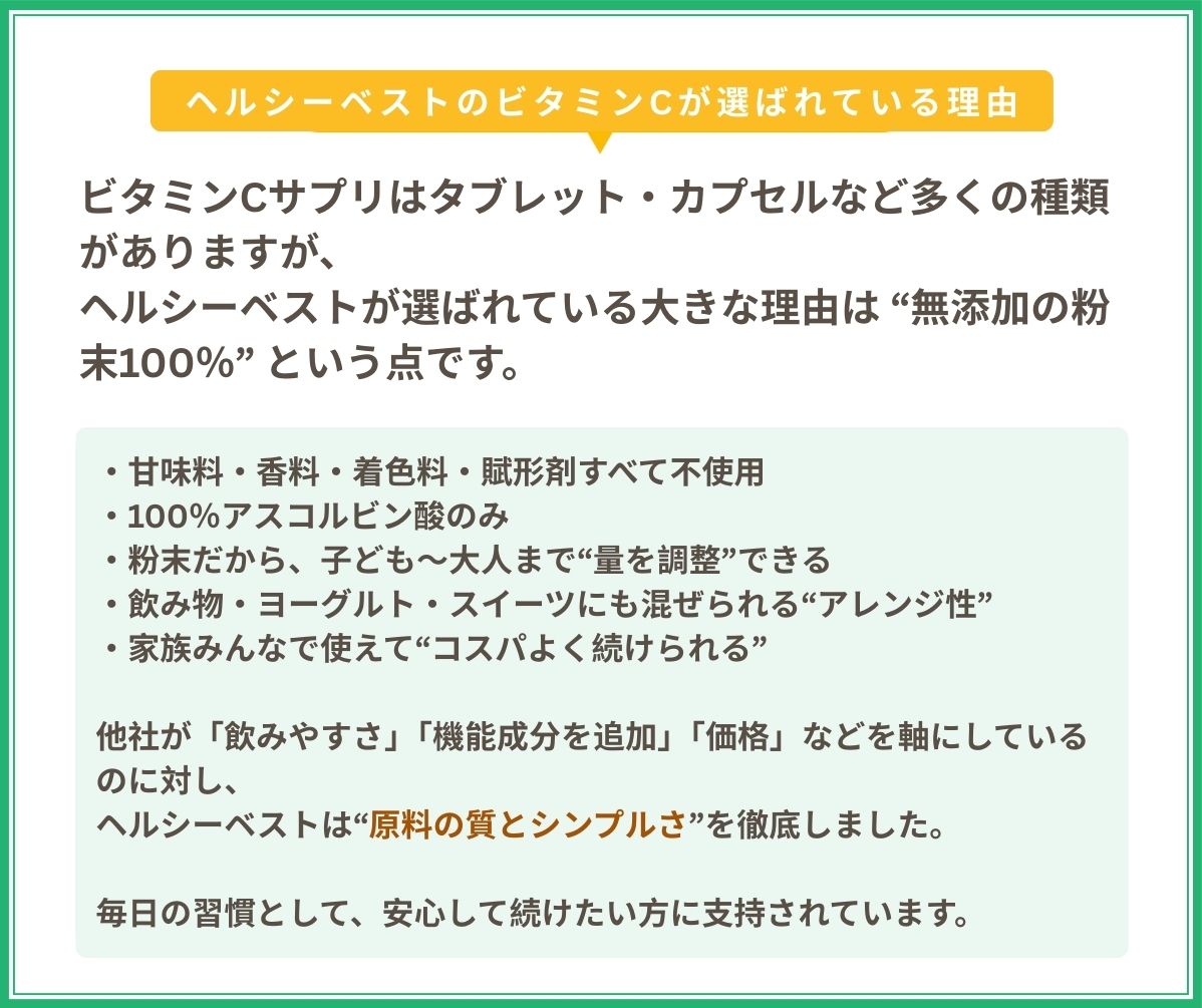 世界で流通しているビタミンCの多くは中国産ですが、ヘルシーベストはあえて“産地の確かさ”にこだわりました。